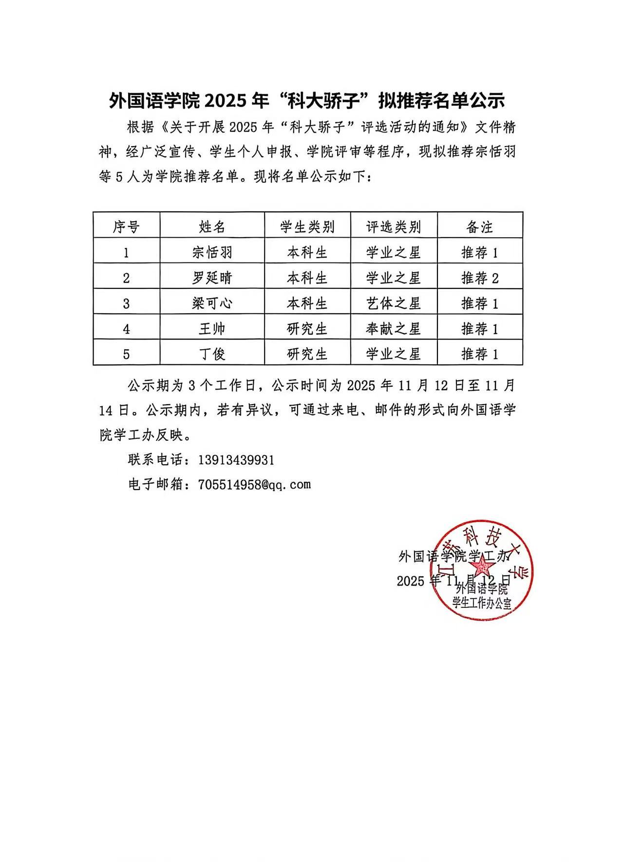 外国语学院2025年“科大骄子”拟推荐名单公示