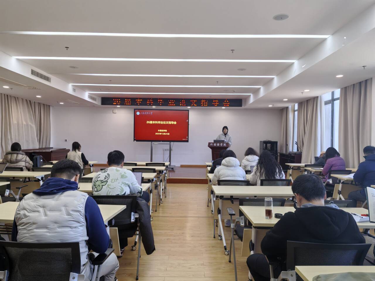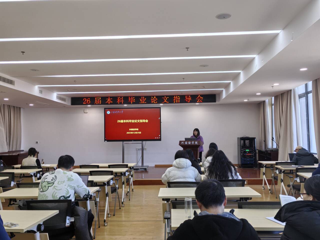 12月25日,外国语学院在学术报告厅召开2026届本科毕业论文指导工作启动会。会议由英语系主任王欢副教授主持,曾景婷院长、韩菁菁副院长出席,各专业负责人、系部主任及论文指导教师参加会议。