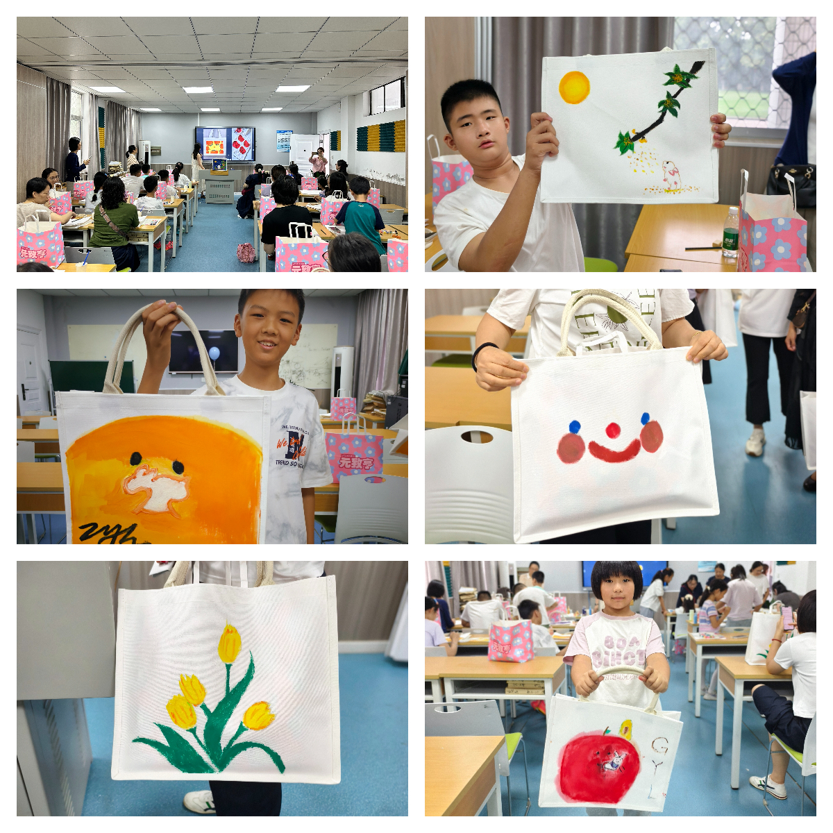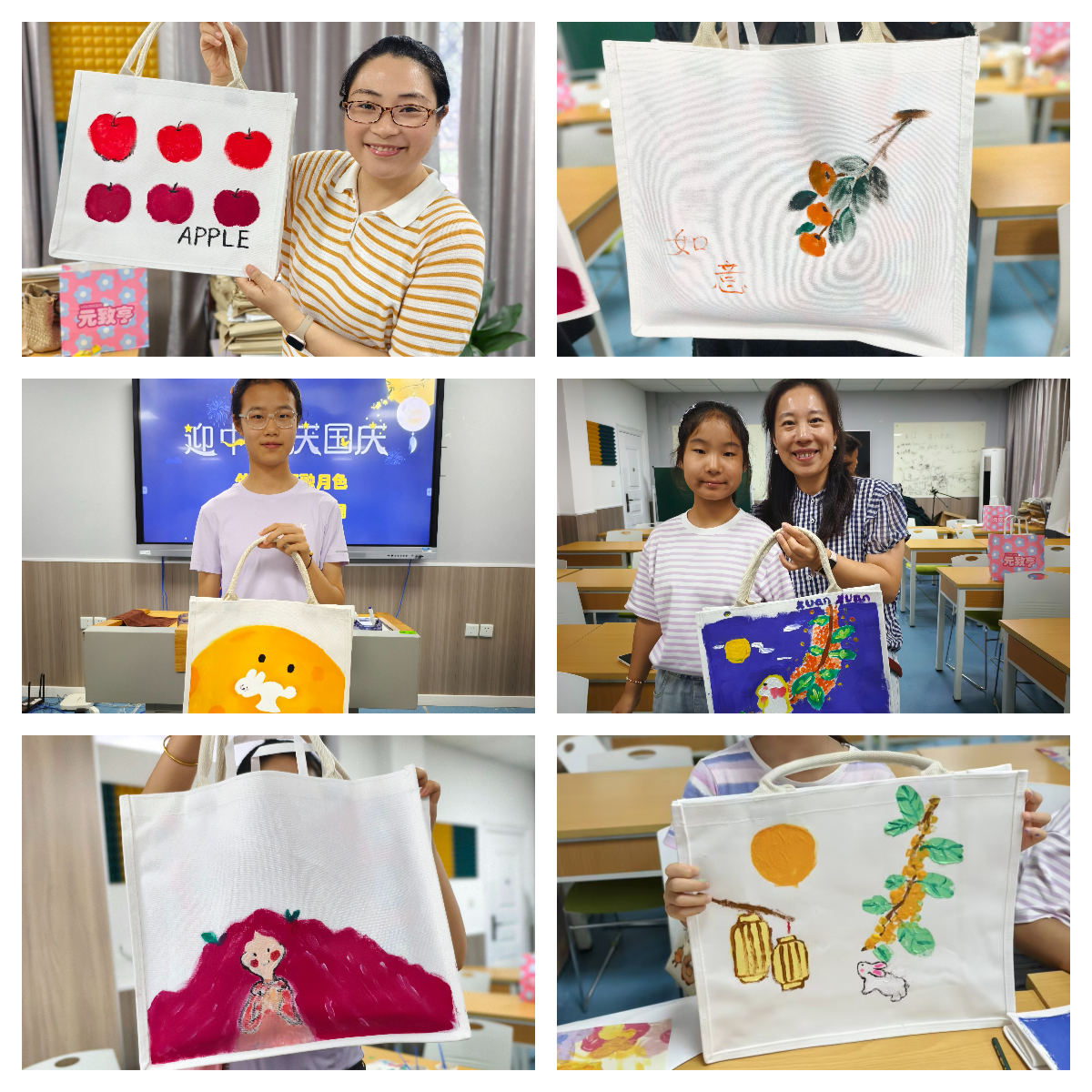 这是一场充满诗意与温情的聚会,学院教师25组家庭齐聚教3-119室,共赴一场手绘之约。以帆布为纸,蘸月色为墨,让家长与孩子指尖流转创意,将团圆意、思念情绘入包中。活动伊始,教师们签到并配合彩绘老师领取了装饰材料,随后彩绘师对彩绘布包的知识进行了详细讲解,学员们听得津津有味,随后便迫不及待地分组开启创作之旅。创作现场宛如一个充满奇幻色彩的魔法世界,孩子们的创意天马行空,他们用稚嫩的笔触描绘着心中对节日的美好祝愿;家长们则在一旁悉心指导,眼神中满是温柔与鼓励。每一幅作品,都是老师们独特创意的绽放,更是亲子间默契与深情的凝聚。
